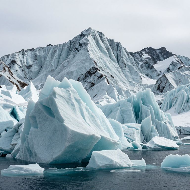 Photograph of towering, jagged icebergs floating in a dark blue ocean, with a snowy, mountainous glacier-covered background under a cloudy sky