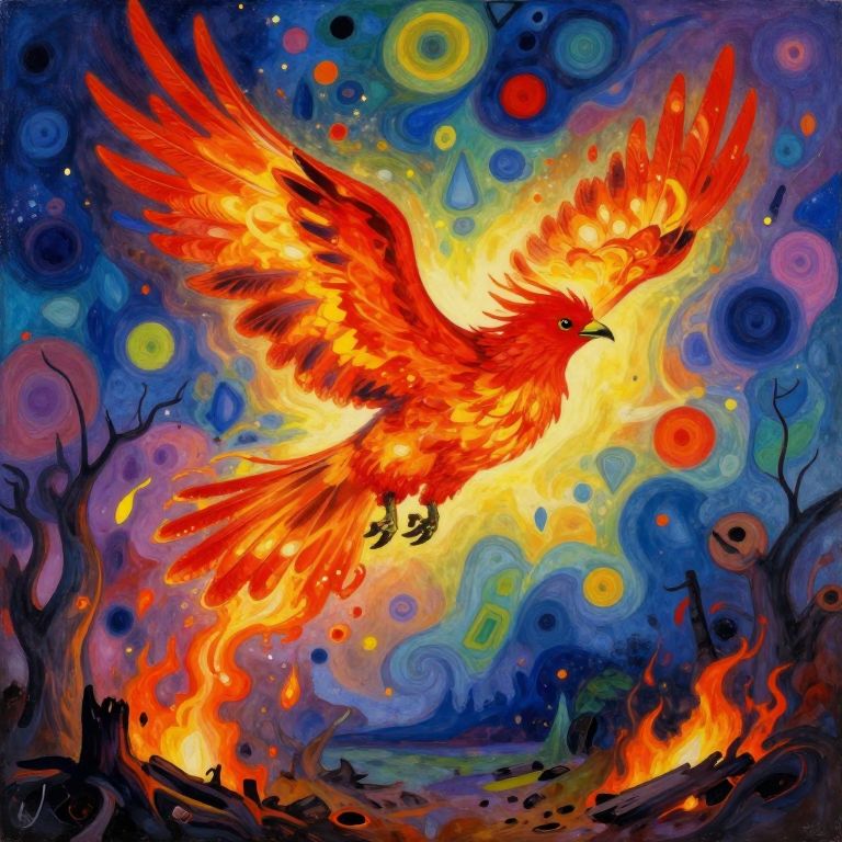 Vibrant digital painting of a fiery red phoenix soaring amidst a swirling, colorful, abstract background with yellow, blue, and purple circles. Dark,