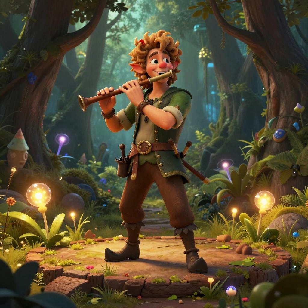 Halfling bard male with curly hair and mischievous smile, holding a flute, standing on a forest stage surrounded by magical glowing plants, whimsical fantasy style