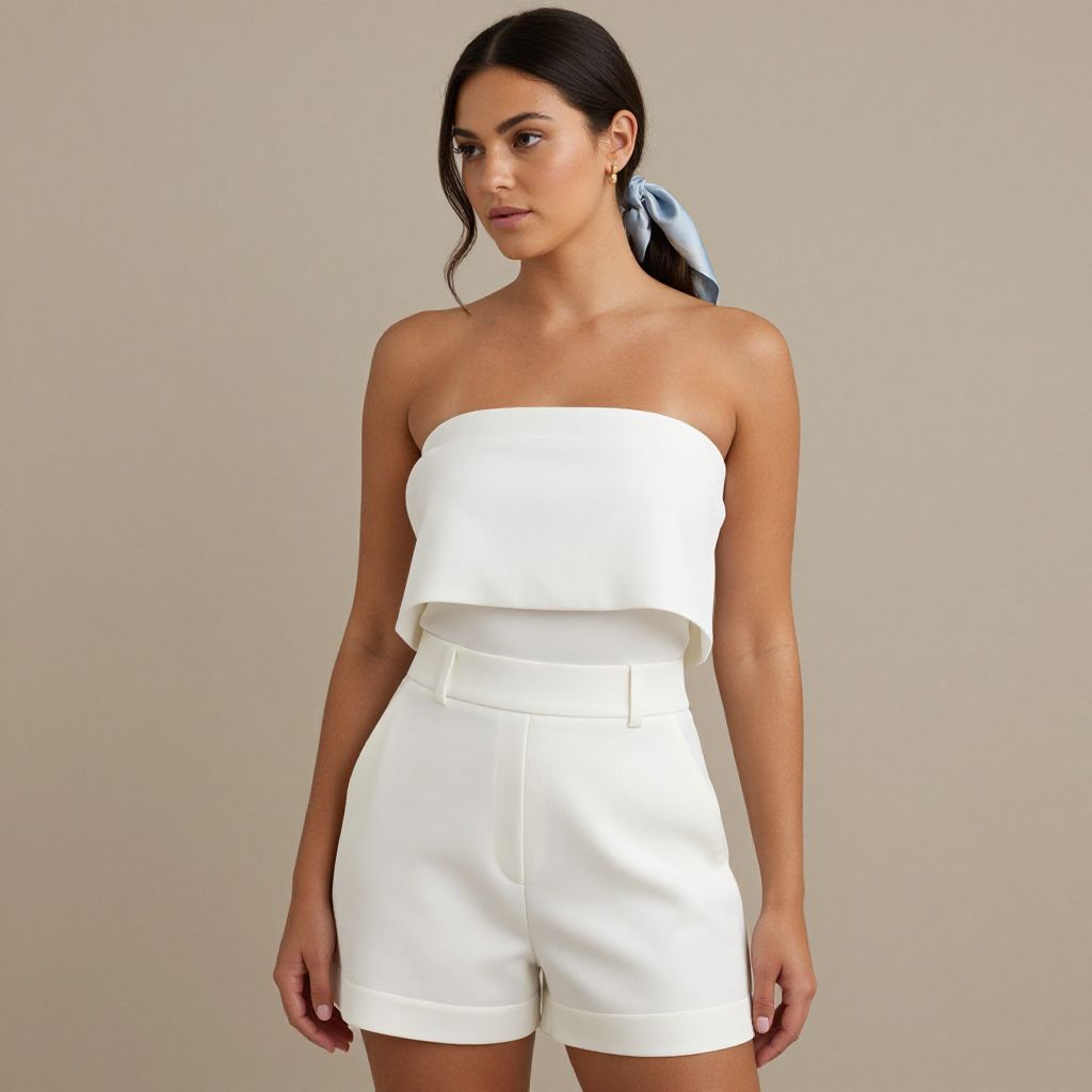 Photograph of a young woman with light olive skin and dark brown hair tied back with a light blue ribbon, wearing a strapless, white, ruffled top and high-waisted white shorts. Her arms hang naturally by her sides, and she gazes slightly to the right with a neutral expression. The background is a plain, light gray, which makes the white outfit stand out prominently. The image has a clean, minimalist style, emphasizing the simplicity and elegance of the clothing. The lighting is even, highlighting her natural features and the crisp texture of the fabric.
