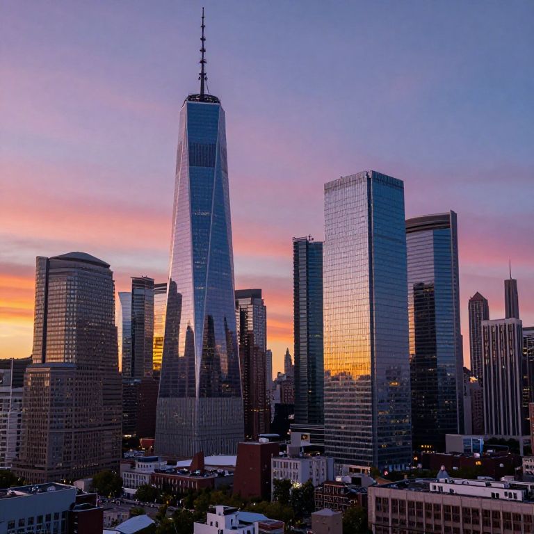 A panoramic shot of a city skyline at sunset, highlighting iconic buildings and the reflection of the colorful sky on the glass towers.
