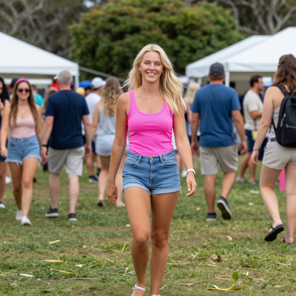 Photograph of a smiling blonde woman with long hair, wearing a bright pink tank top and high-waisted blue denim shorts, walking through a grassy outdoor area. She has a slim build and is wearing white sneakers. In the background, there are several people, both men and women, dressed in casual summer attire, walking in different directions. White tents are visible in the distance, surrounded by trees. The image has a vibrant, colorful style with a shallow depth of field, making the woman in the foreground sharp while the background is slightly blurred.
