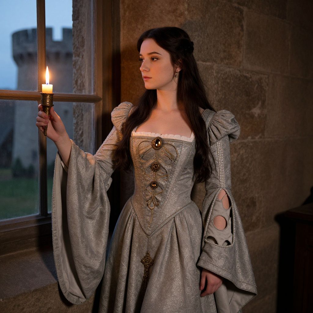 Photograph of a pale-skinned woman with long, dark brown hair, standing in a dimly lit stone room beside a window. She wears a silver, medieval-style gown with puffed sleeves, elaborate buttons, and a white lace trim at the neckline. She holds a lit candle in her right hand, gazing out the window. The background includes a blurred, dark castle silhouette at dusk. The room's stone walls and window frame add a medieval atmosphere. Her expression is pensive, and the candlelight casts a warm glow on her face and gown.