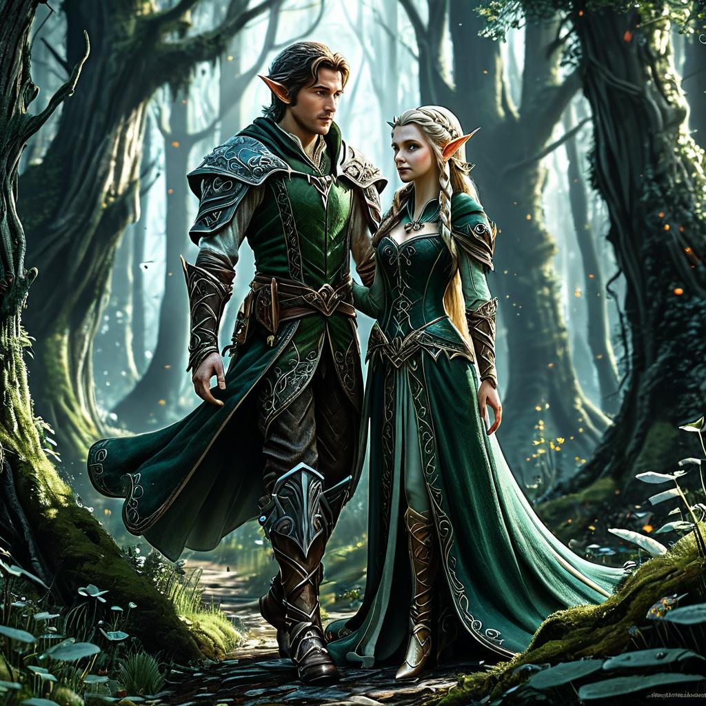 Digital artwork of an elf couple in medieval armor standing in a mystical forest, with sunlight filtering through tall trees. The male elf has short dark hair,