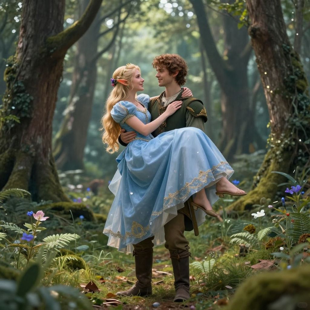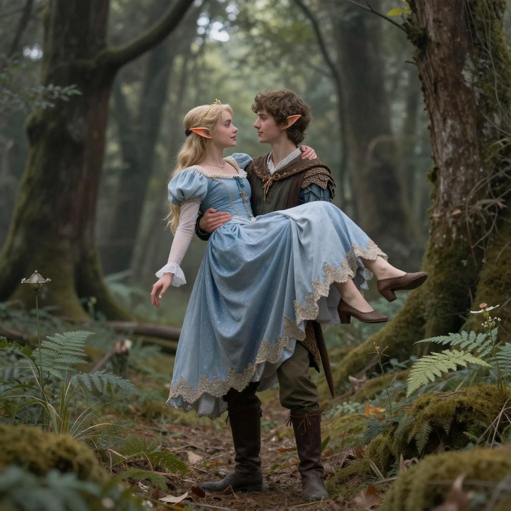 1girl, 1boy, princess carry, full body, fantasy, elf, forest, masterpiece, best quality, highly detailed