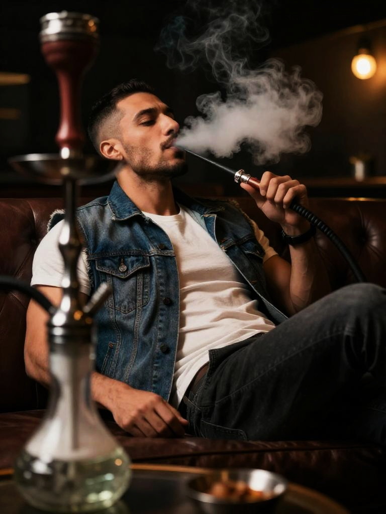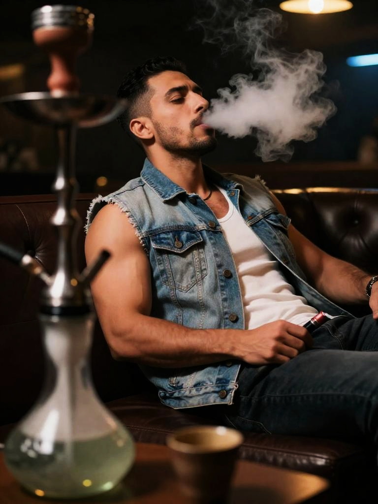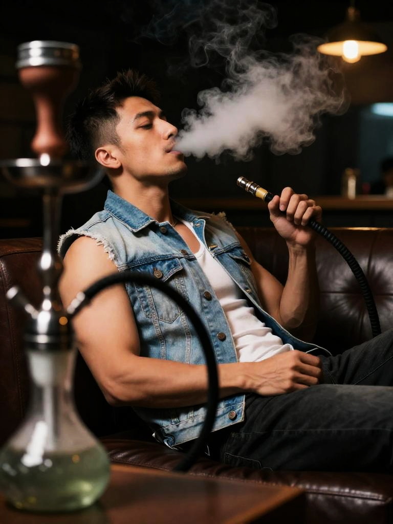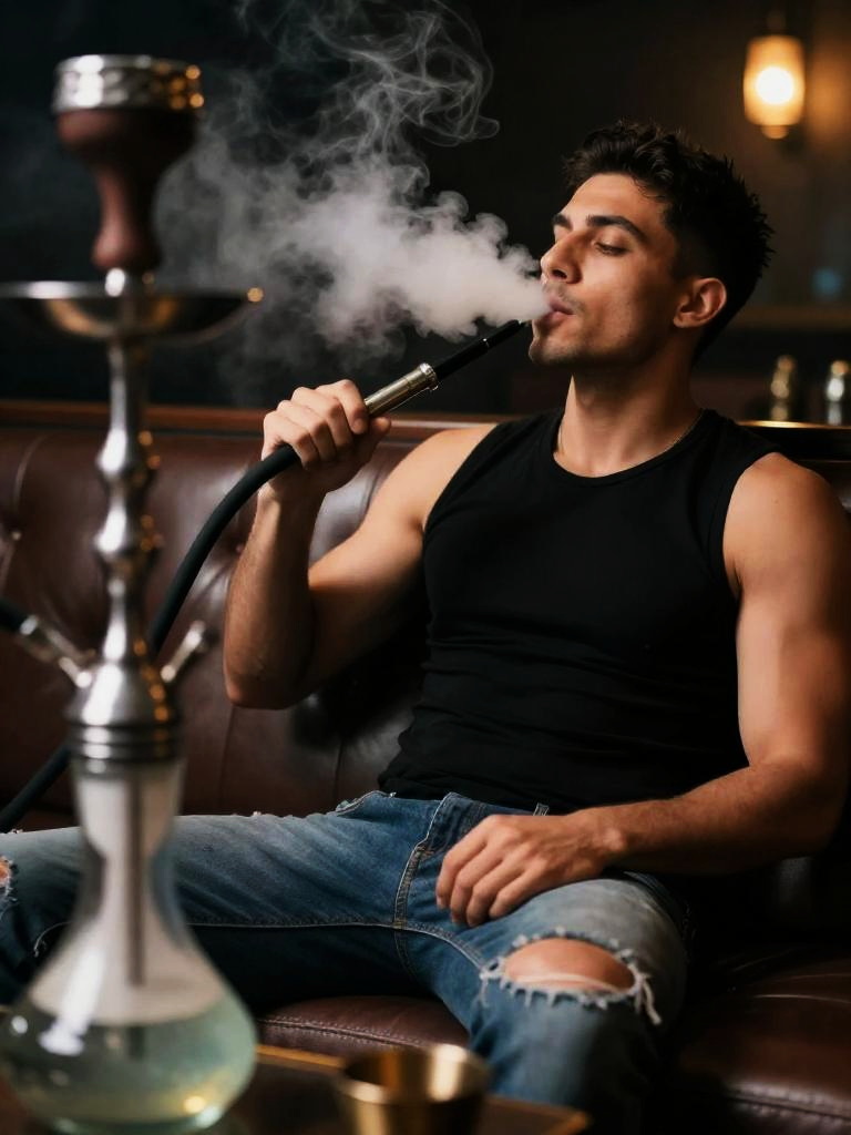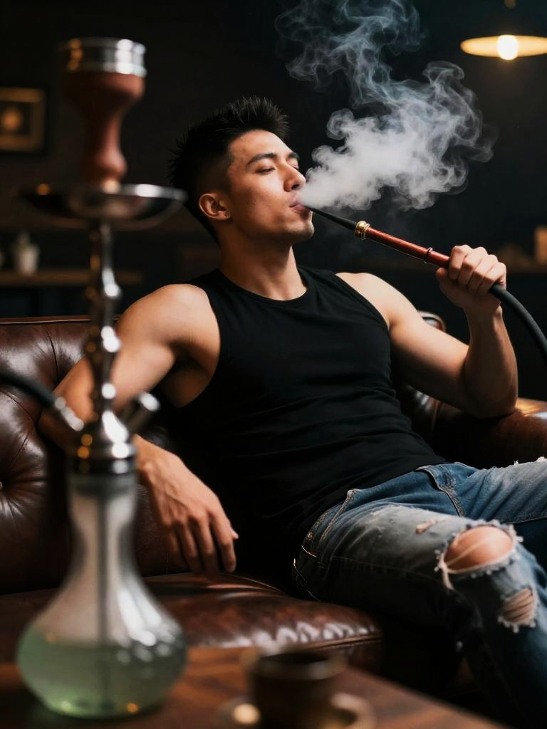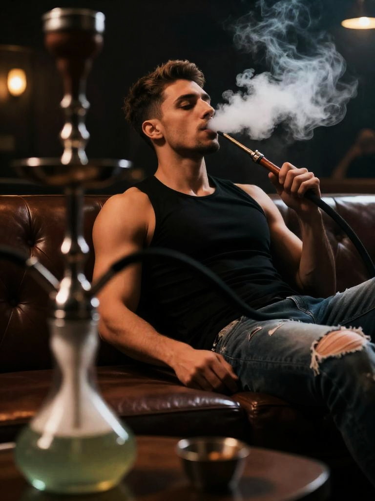 Man smoking shisha, adult man reclining on a leather sofa in a dim lounge, slim man with textured short hair and sharp jawline wearing fitted black sleeveless shirt and ripped jeans, holding the hookah hose close to his mouth as he exhales a thick cloud of smoke, large modern hookah with tinted glass base prominently blurred in the foreground, low depth of field, atmospheric shadows and soft warm highlights, cinematic lifestyle photograph, ultra realistic, high resolution