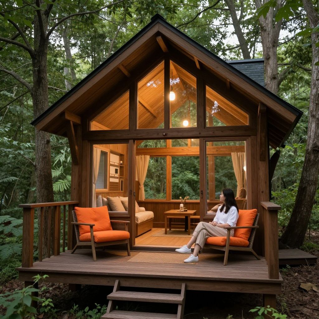 Photograph of a woman with long dark hair, wearing a white blouse and blue jeans, sitting on an orange cushioned wooden chair on the porch of a small, A-frame, wooden cabin surrounded by a dense forest. The cabin's large front windows and glass door illuminate the cozy interior, which features matching orange cushions on two chairs and a wooden table with a lamp. Warm, soft lighting from wall-mounted sconces adds a inviting glow. The woman is reading or looking down, with her legs crossed. Tall trees and lush greenery frame the scene, creating a serene, nature-filled atmosphere.