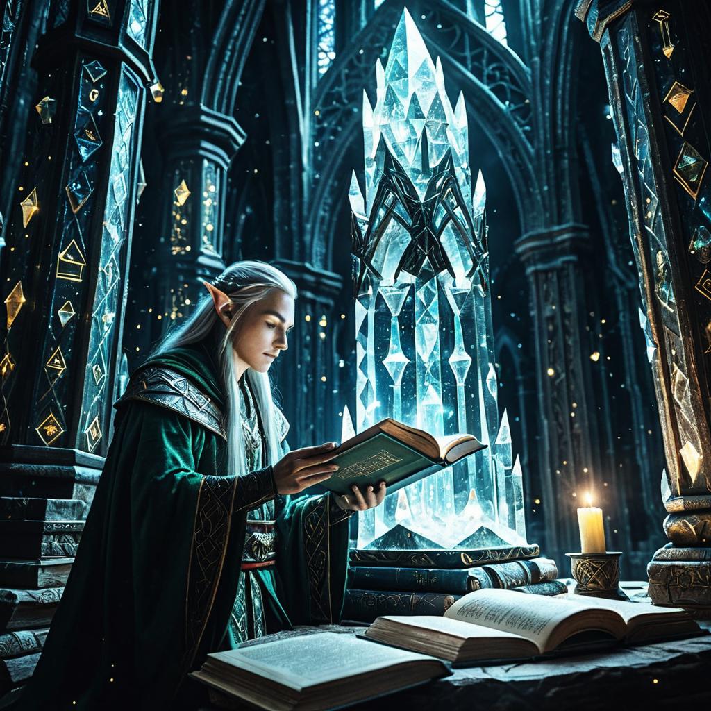 Elven Scholar Reading Magical Tome in Crystal Tower