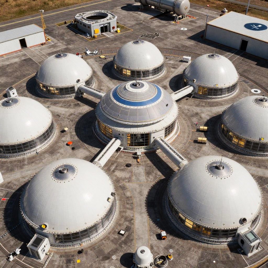 An high-tech space colony, viewed from above. dome habitats, landing pads.