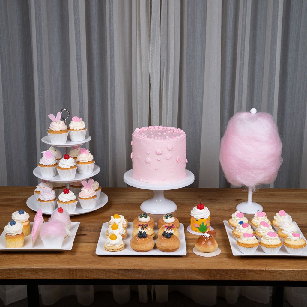 Cotton candy-inspired desserts elegantly displayed on a wooden table, featuring a tiered stand of cupcakes, a cylindrical cake covered in pink candies, and a variety of pastries and treats arranged neatly beneath a backdrop of sheer curtains.