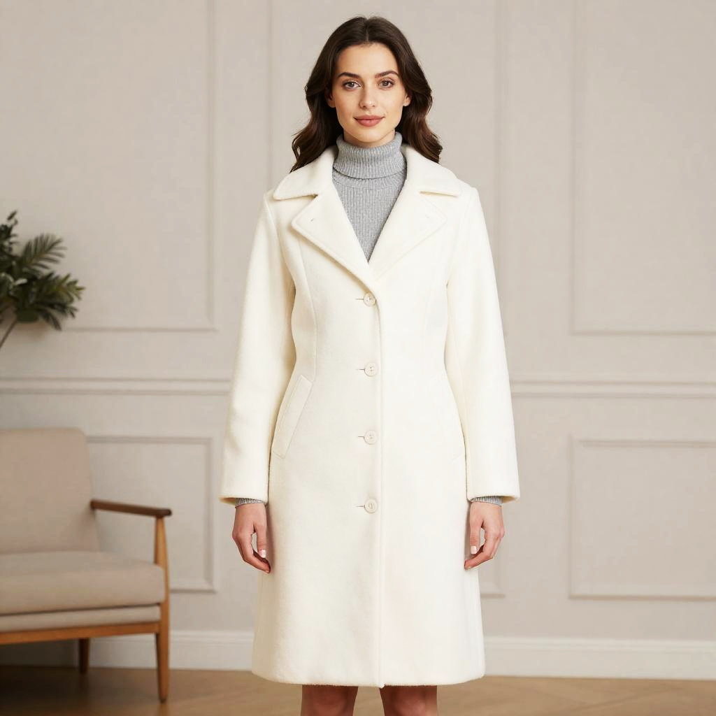 Portrait of a cheerful young woman with long wavy brown hair wearing a fitted white dress and a white shawl with fringes, standing against a plain light gray background with hands on hips.