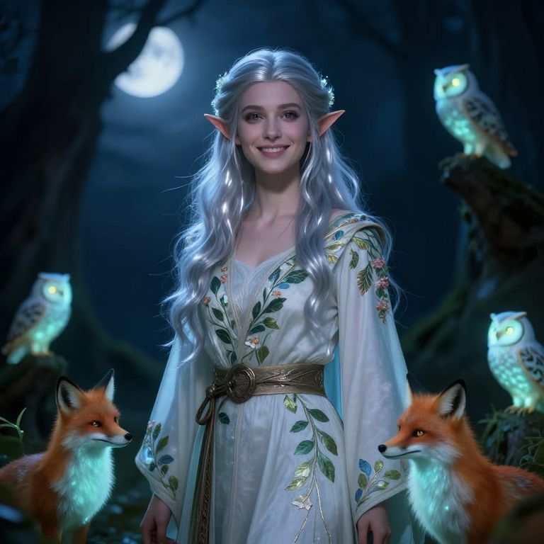 Portrait of an eladrin druid female in a moonlit glade, silver hair shimmering, wearing robes embroidered with leaves and flowers, gentle smile, mystical aura, with glowing animals like owls and foxes around, fantasy character concept art.