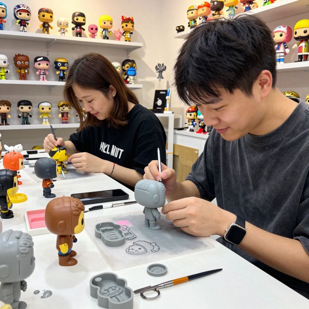 Custom Funko Pop maker in action, a bright creative space filled with molds, smiling artist customizing figures with fine detail, diverse characters being made, background shelves full of collector’s items, playful and imaginative atmosphere with vivid colors.