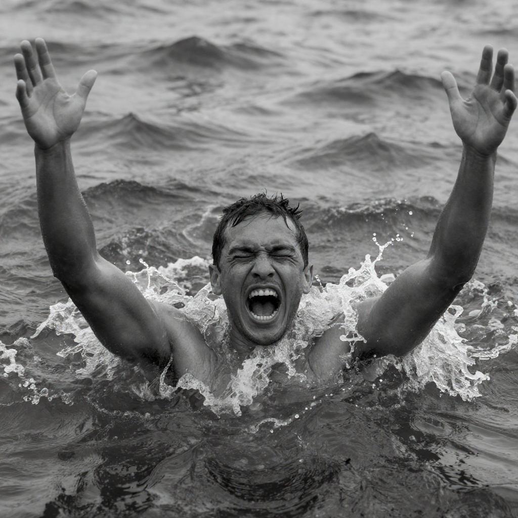 Black and white photograph of turbulent water with white foam. Two people partially submerged, struggling near a partially submerged boat. Large cylindrical object on the right. Another boat in the background. Dark shadows and intense light contrasts.