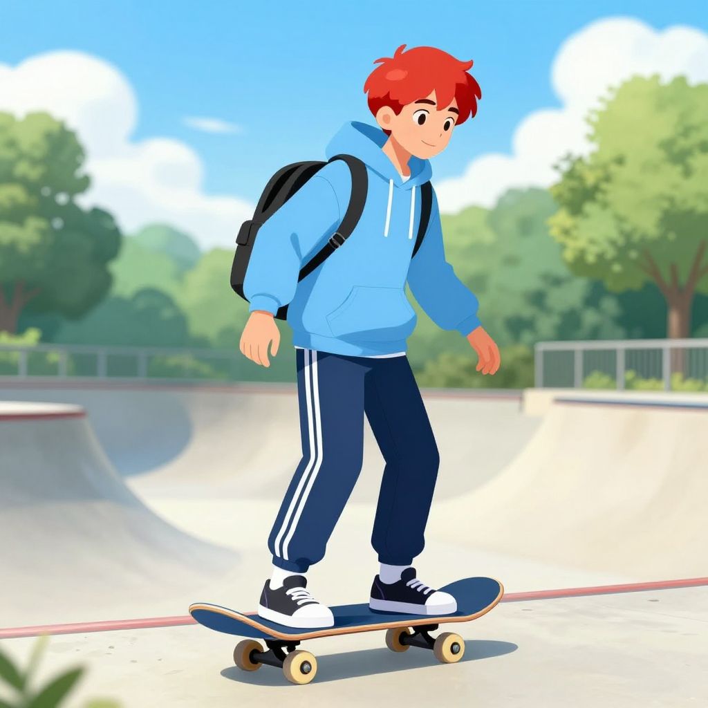 Digital cartoon of a red-haired boy with a backpack, blue hoodie, and black track pants, skateboarding in a sunny park.