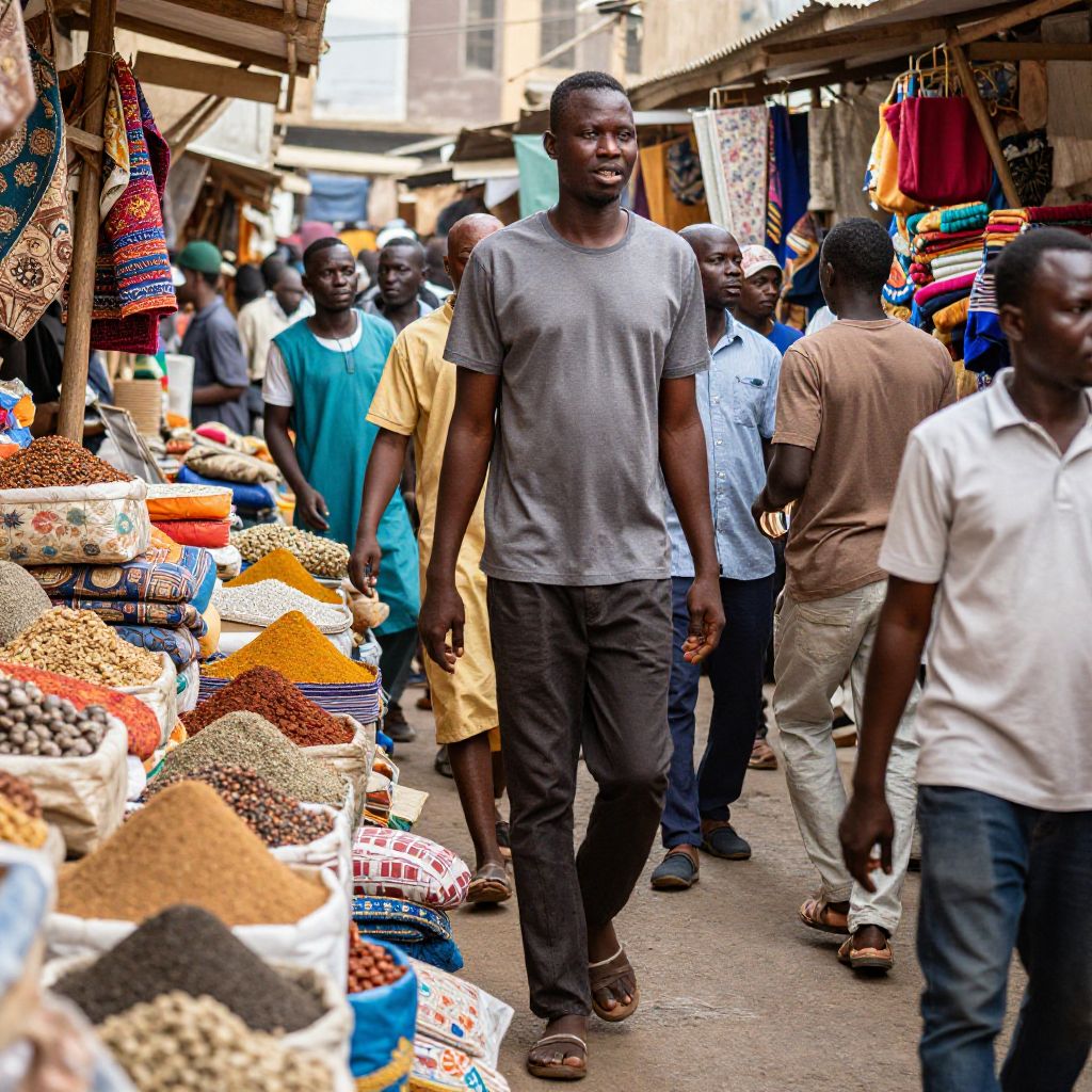 Tall African man walking through a bustling market street, mixed textures of fabrics and spices around, energetic atmosphere, vibrant colors and dynamic composition, focus on motion and lively expressions, warm natural light reflecting off surfaces