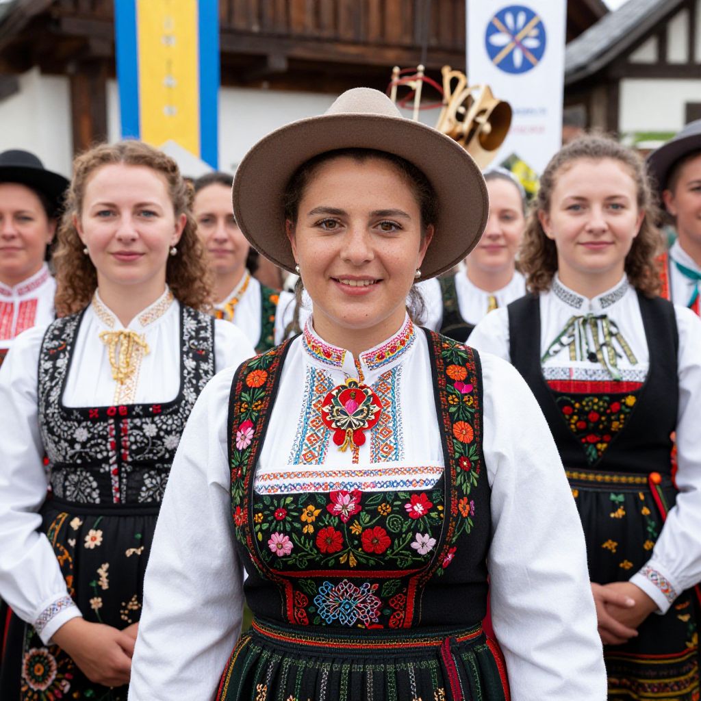A group of women in traditional Slovenian folk costumes gathering at a village festival, each wearing unique regional patterns on their dresses, including floral prints and geometric embroidery, one woman has a large red brooch on her chest and wears a wide-brimmed hat, their faces show joyful expressions with distinct Slovenian features—high cheekbones, curly brown hair, and warm brown eyes, set against a backdrop of colorful banners and traditional music instruments. The woman has big tits and cute face