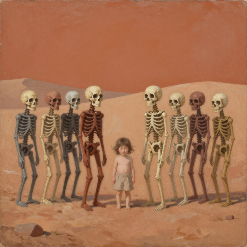 Advertising Campaign a painting depicting a group of dead figures in a desert, in the style of eric zener, alan lee, humanistic empathy, terracotta, album covers, symmetrical balance, child-like innocence,