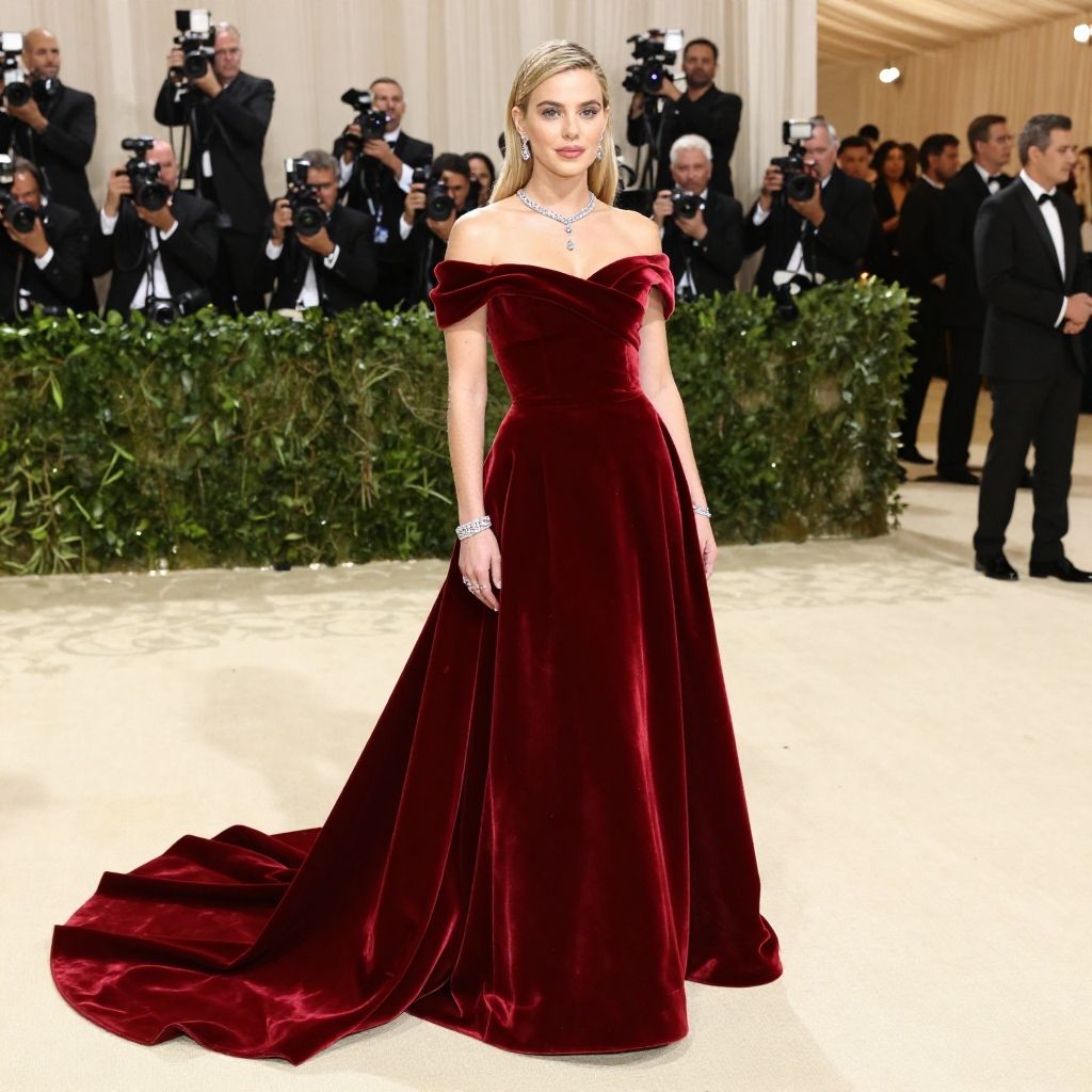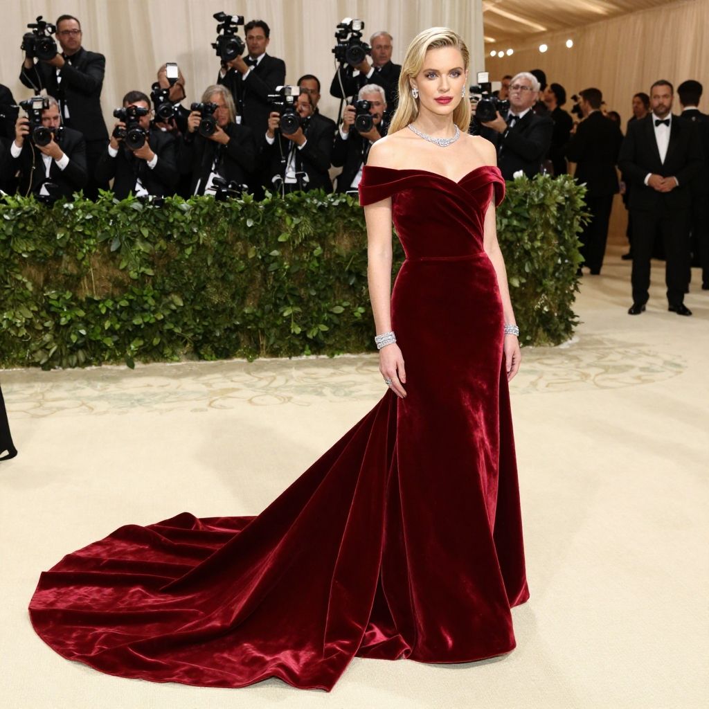 Photograph of a blonde woman in an off-the-shoulder, deep burgundy velvet gown with a long, flowing train, standing on a white floor. She wears a silver necklace, bracelet, and earrings. Her hair is styled in an elegant updo. The background features a row of photographers in black suits, holding cameras, and green shrubs. The setting is a grand, well-lit indoor space with white columns. The woman's makeup is subtle, and her expression is confident. The overall style is glamorous and sophisticated.