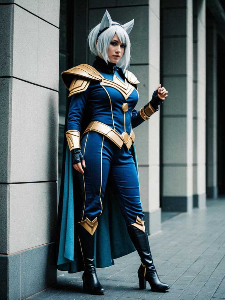 Photograph of a woman cosplaying as a fantasy character. She has silver hair with cat ears, wearing a dark blue form-fitting suit with gold-trimmed armor shoulders and boots. A long blue cape flows from her back. She stands against a modern, grey building wall with black tiled flooring, her right hand resting on the wall. Her confident pose and serious expression highlight her cosplay. The image has a slightly stylized, high-contrast, almost digital art feel, with sharp edges and vivid colors.