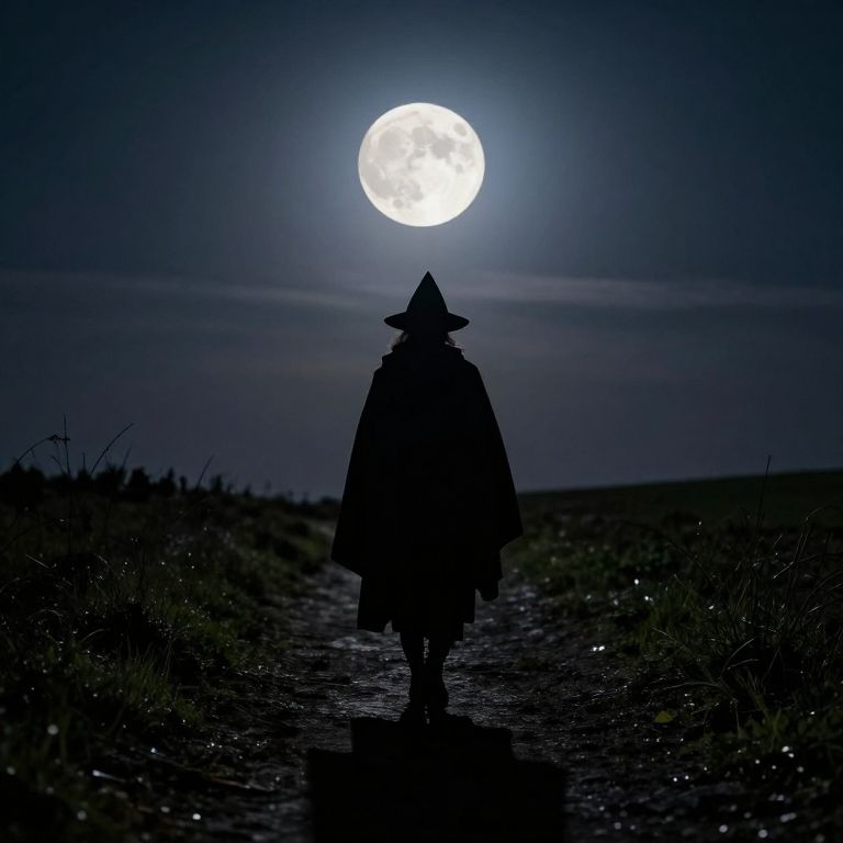 Silhouetted against a radiant full moon, a solitary figure clad in a pointed hat and flowing cloak strides forward through a grassy path, casting long shadows as it embarks on a nocturnal journey under the watchful gaze of the celestial orb.