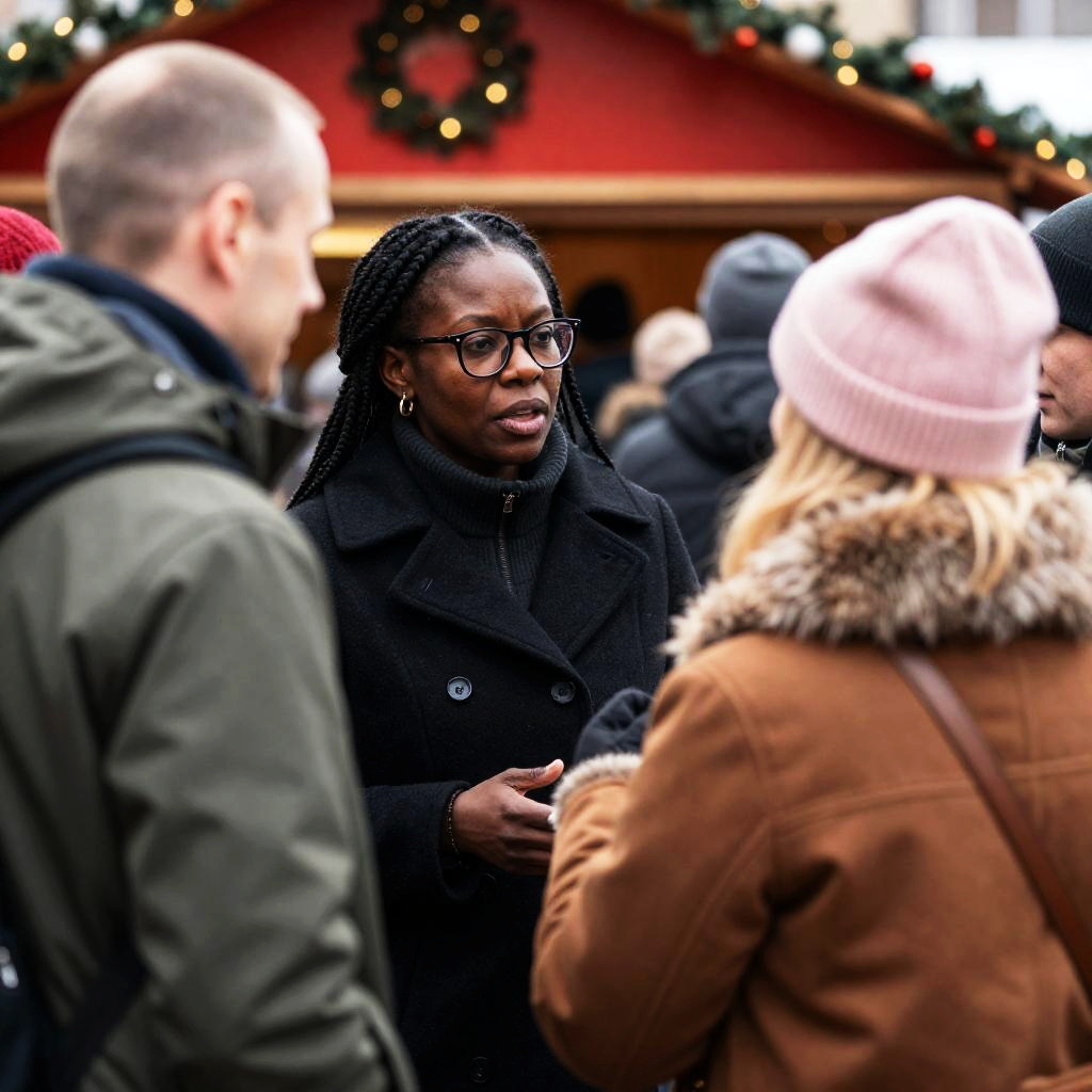 A Black woman with short hair, wearing a green jacket and beige beanie, stands at a Christmas food stall. She holds a red serving tray, preparing food in large pots. The stall has a red tablecloth, Christmas decorations, and a green sign. A red Santa hat hangs from the table. Background includes decorated trees.