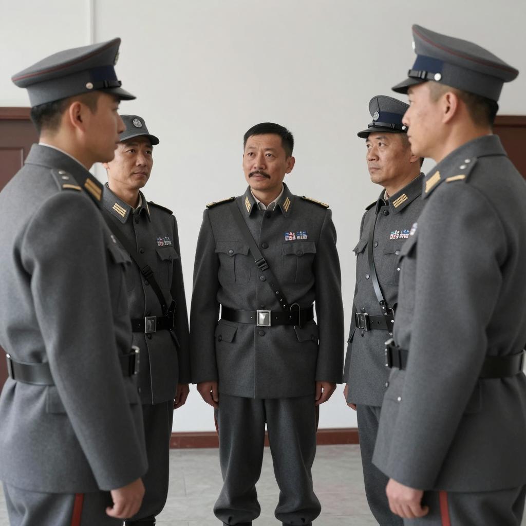Group of five Asian men wearing gray uniforms with badges and belts standing and sitting in an office. One man is seated at a desk writing, while others stand in a line or in the background. The room features wooden shelves with books and industrial equipment, and a large metal fan is visible to the left.