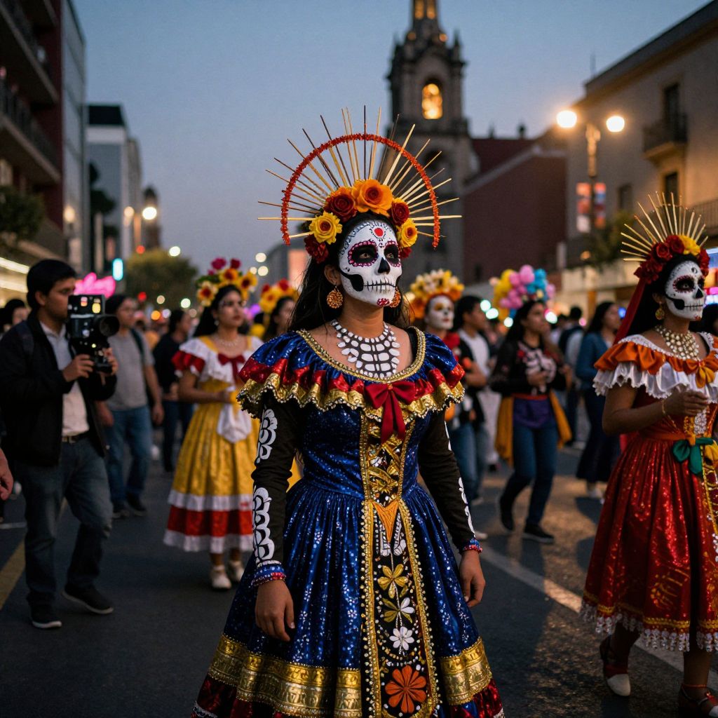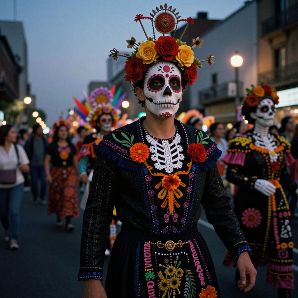 Vibrant Day of the Dead celebration unfolds in a bustling street festival, featuring a woman adorned with intricate sugar skull makeup, a floral crown of red and orange roses, and a traditional black dress embellished with red floral patterns, as other participants in festive attire gather around her in the lively urban setting.