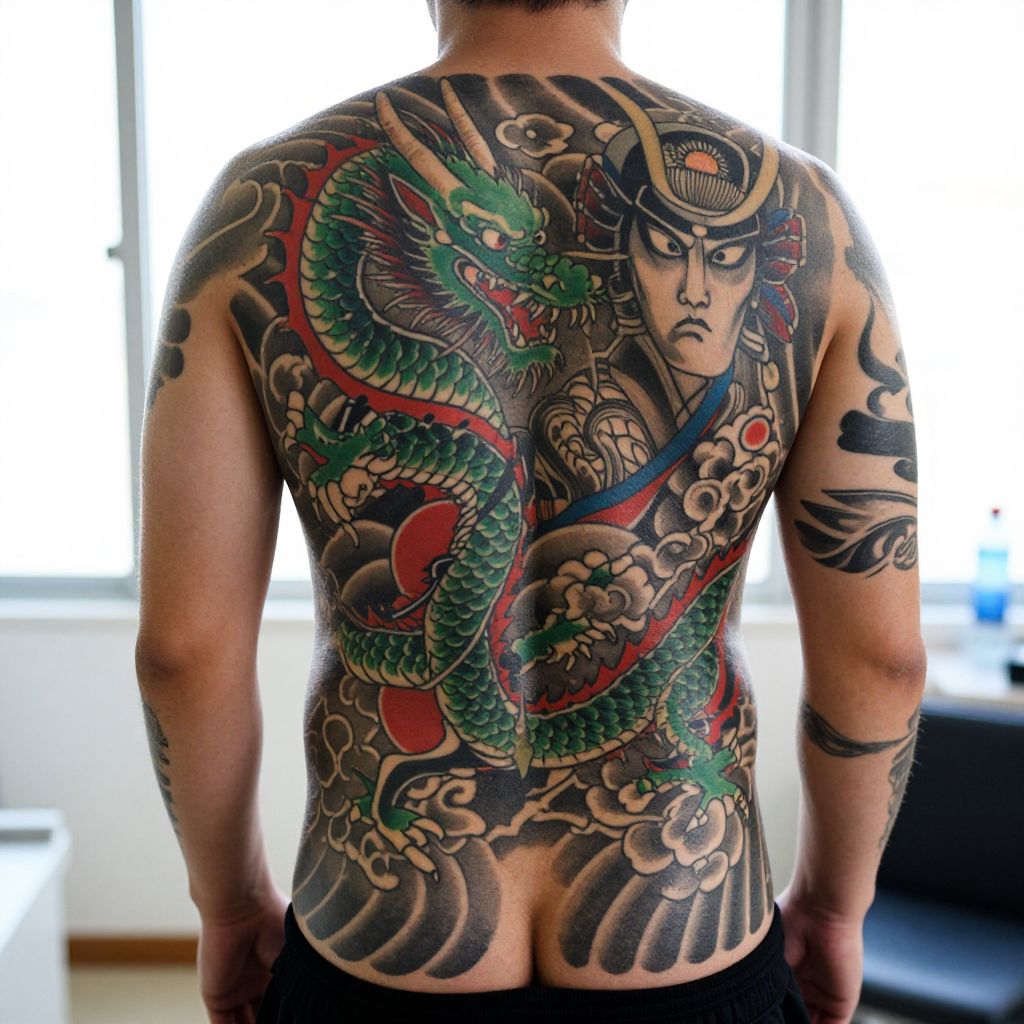 Photograph of a man from the back, showcasing a vibrant, full-sleeve Japanese-style tattoo covering his entire back. The tattoo features colorful dragons, clouds, and a traditional samurai face. His right arm has additional black ink tattoos. He stands in a brightly lit room with large windows in the background. The tattoos are rich in detail and color, with a mix of green, red, blue, and black.