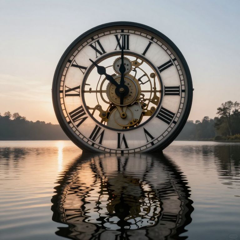 Photograph of a large, antique-style clock face with Roman numerals, standing upright in calm water at sunset. The clock's glass is translucent, revealing intricate mechanical gears and black clock hands. The sun is low on the horizon, casting a golden reflection on the water's surface. The background features a silhouette of trees and a clear, pale blue sky. The clock's reflection is distorted in the water, adding a surreal touch to the image. The overall mood is serene and timeless, with soft lighting enhancing the clock's elegance.