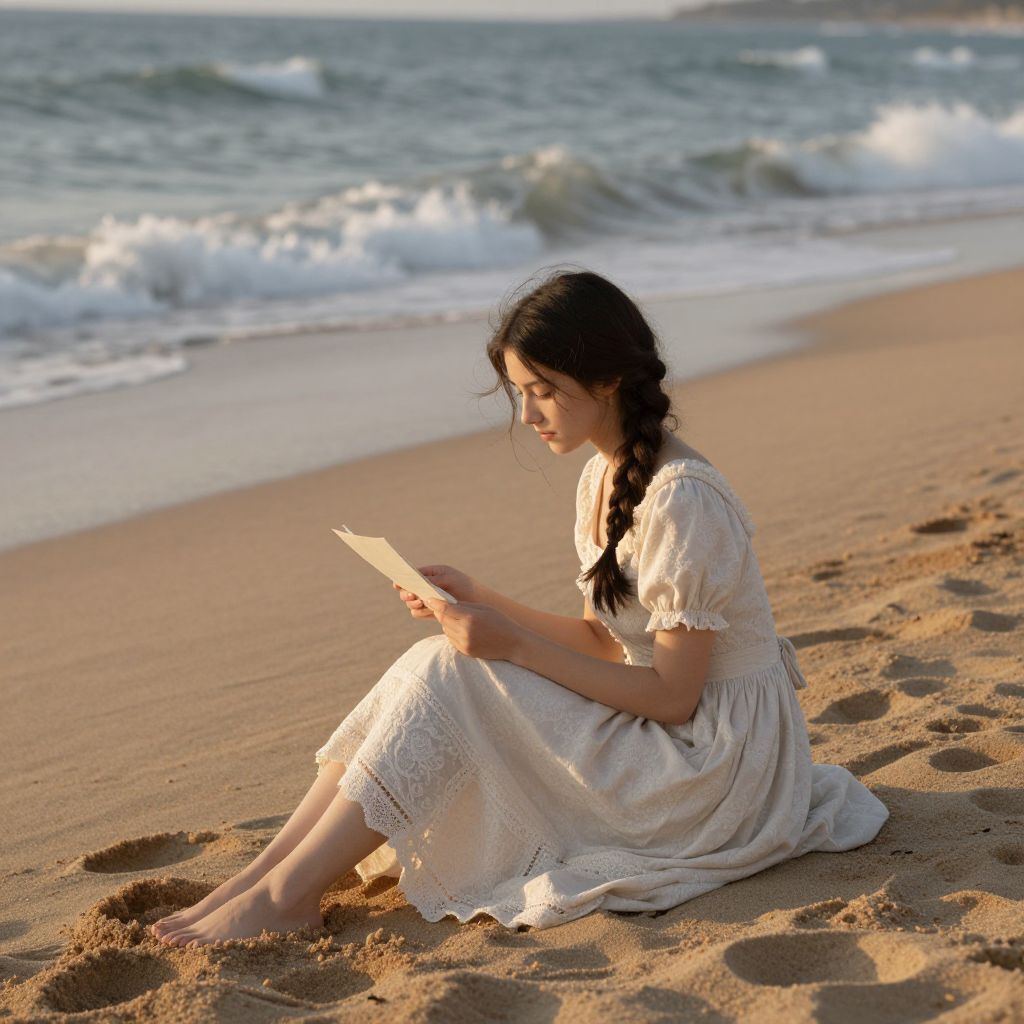 A serene fine art print captures a young woman in a vintage-style dress reading a letter on a sandy beach, surrounded by impressionistic waves and golden-hour lighting, evoking a tranquil and timeless atmosphere.