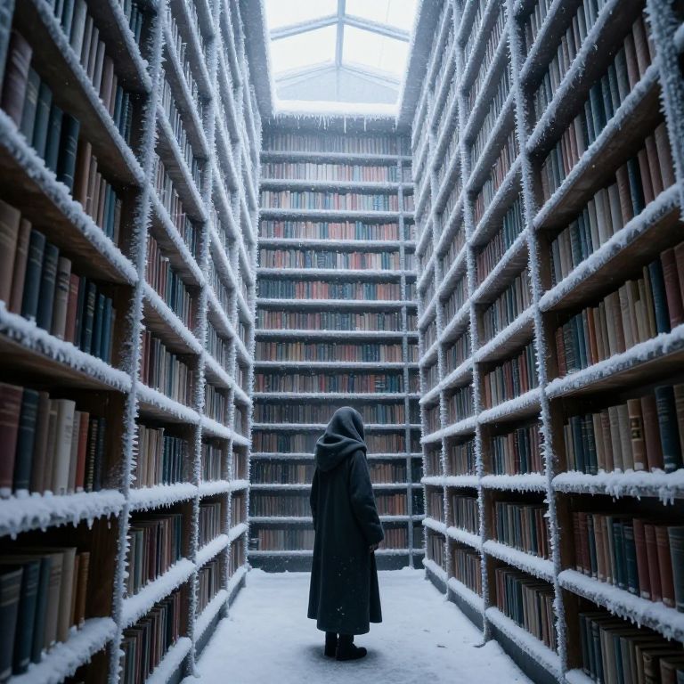 Photograph of a snow-covered library with tall, narrow aisles flanked by rows of wooden bookshelves. A solitary figure, dressed in a long, dark, hooded coat, stands at the center, facing away. The shelves are lined with books, some with visible red and brown spines. The ceiling is glass, allowing light to filter through and create a stark contrast with the white snow. The floor is also covered in snow, adding a cold, serene atmosphere to the scene. The perspective draws the viewer's eye upward, emphasizing the towering bookshelves and the expansive, tranquil space.