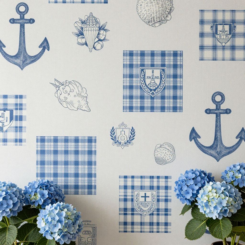 Blue preppy wallpaper collage merging seaside themes, including anchors, seashells, and wild blue hydrangeas, intertwined with classic tartan checks and elegant heraldic symbols, producing a sophisticated yet playful visual ambiance for interior spaces.