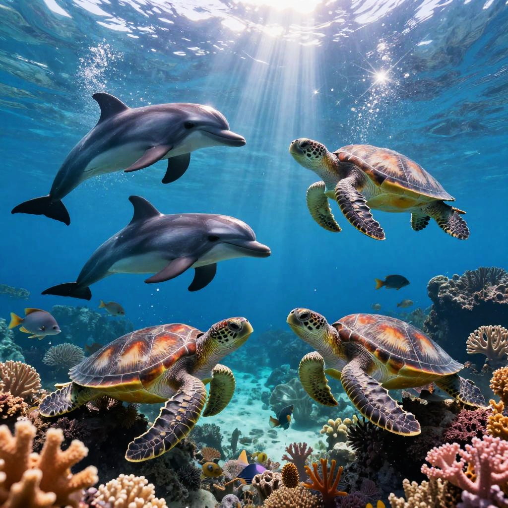 Animal picture generator illustrating a playful underwater scene with a variety of sea creatures such as dolphins, turtles, and colorful coral reefs, enhanced with sparkling light rays and dynamic composition, evoking the vibrant life beneath the ocean surface.