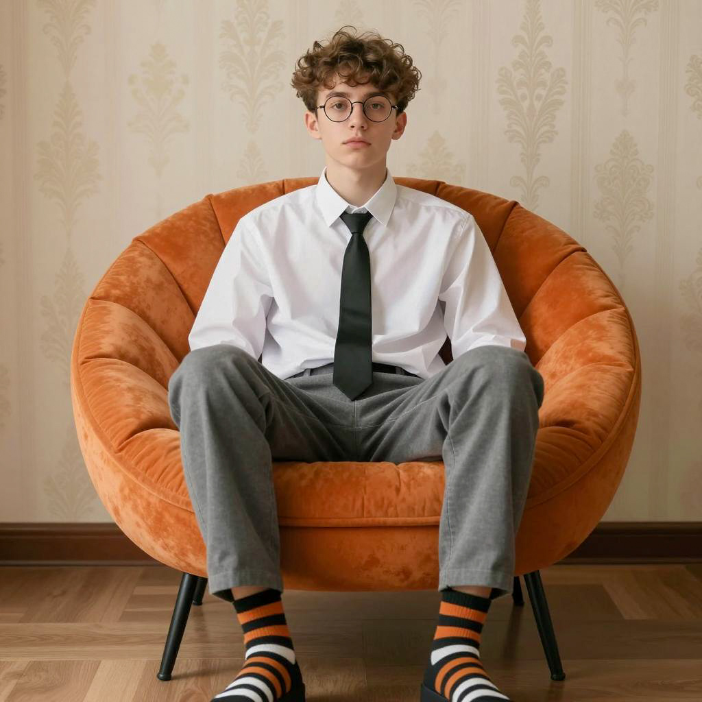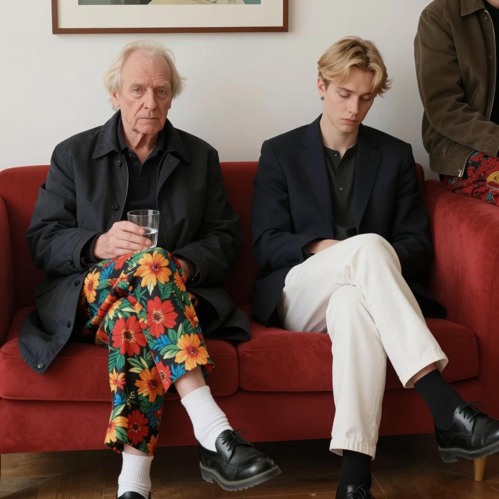 Two men sitting on a red couch. Older man with thinning blonde hair, black coat, colorful floral pants, white socks, black shoes, holding a glass. Younger man with short blonde hair, dark suit, white pants, black shoes, crossed legs, looking down. White ured wall, framed picture, partially visible third person in brown jacket and red patterned pants in background.