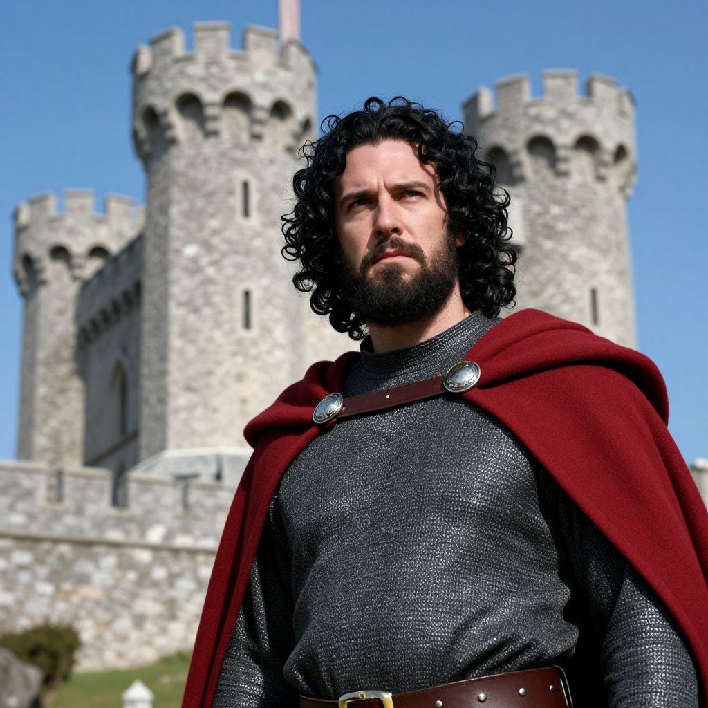 Photograph of a bearded man with dark curly hair, standing confidently in a stone courtyard. He's wearing a long, dark brown medieval-style tunic with a black shirt underneath, a red velvet cape, and brown boots. The background features beige stone walls with architectural details. The man's serious expression and the vibrant red cape stand out against the muted stone.