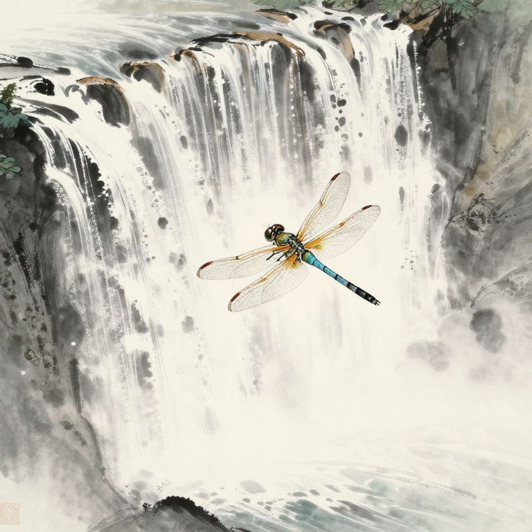An iridescent dragonfly gracefully hovers mid-air over an expansive waterfall shrouded in mist. The scene harmoniously merges Japanese ink wash painting with Renaissance sfumato techniques, employing soft lines and delicate brushstrokes to evoke a serene yet mysterious ambiance. From an elevated aerial viewpoint, the dragonfly's intricate wings catch sunlight amidst the water's dancing light, creating a tranquil atmosphere imbued with awe at nature's beauty.
