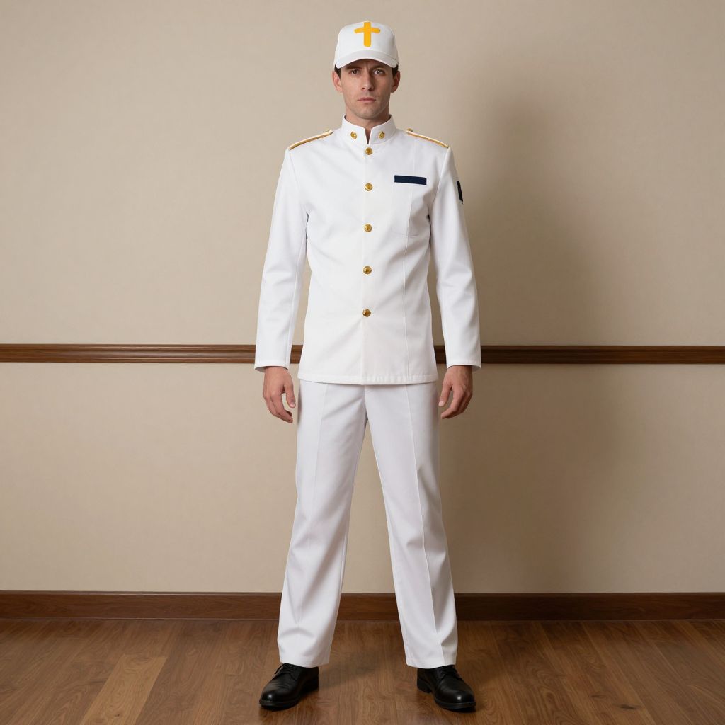 Photograph of a man in a white naval officer uniform with gold buttons, black shoes, and a white cap with a gold cross, standing against a