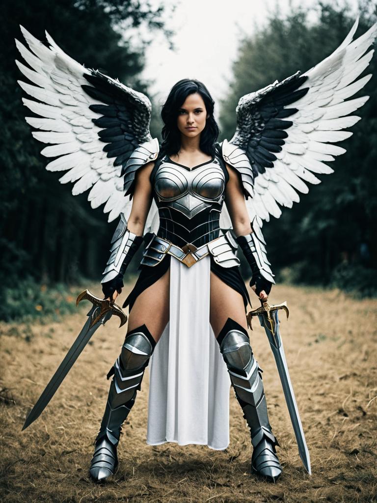 Woman in Warrior Angel Costume, full-body cosplay photo with wings and armor