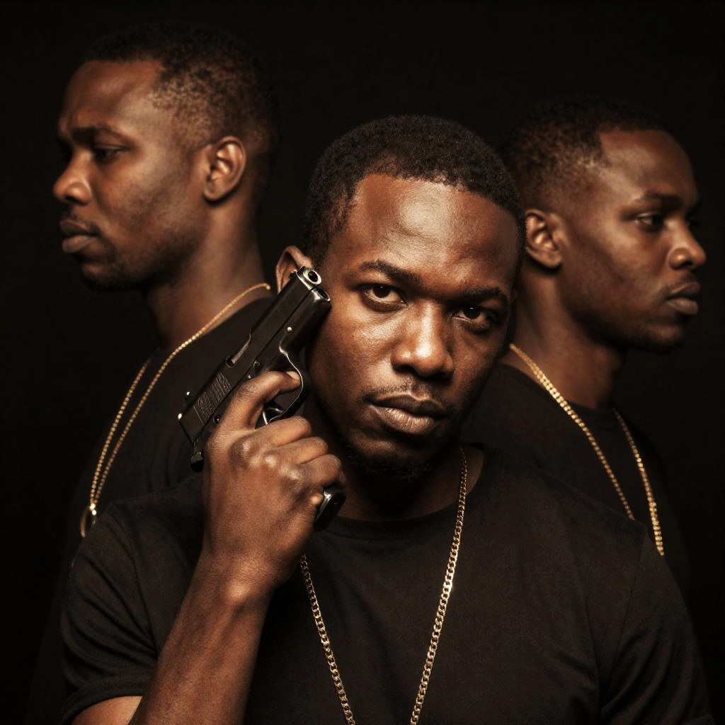 Photograph of two African-American men. Left man has dark skin, short hair, mustache, serious expression. Right man, red-tinted, holding gun, intense gaze, background blurred. Split-screen composition, contrasting lighting.
