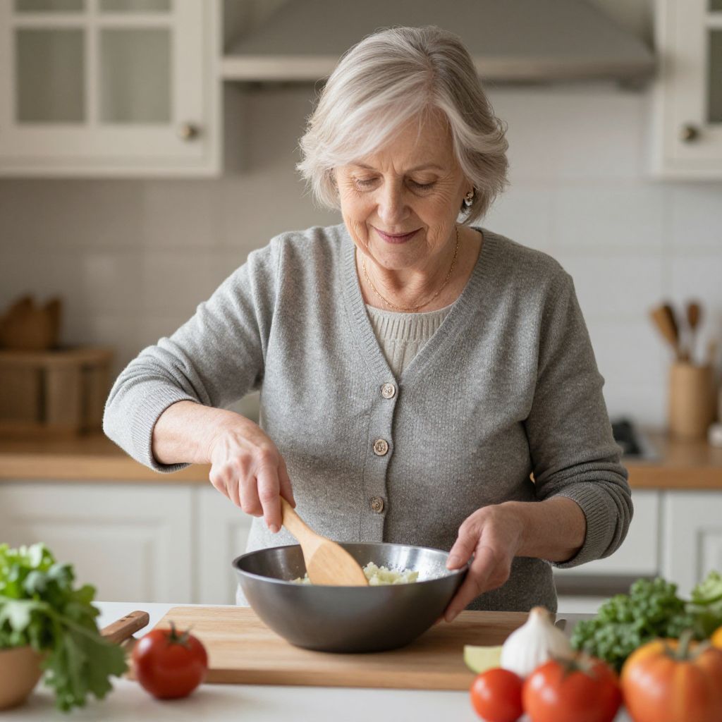Photograph of an elderly woman with short, gray hair and fair skin, wearing a gray cardigan over a beige top, cooking in a bright kitchen. She is stirring a black bowl of salad with a wooden spoon. The kitchen has white cabinets and a wooden countertop. In the foreground, there are fresh red tomatoes, a bunch of green herbs, and a white onion. The background includes a tiled wall and kitchen utensils in a wooden holder. The woman smiles slightly as she cooks. The overall lighting is natural, enhancing the cozy, homey atmosphere.
