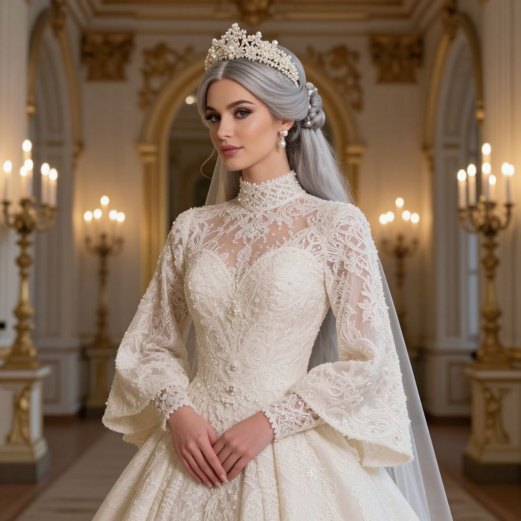 A regal wedding hairstyle, costume: A stunning bride with long, flowing silver hair crowned in a delicate, updo with ornate floral pearls and a subtle chignon, wearing a majestic, embroidered lace wedding gown with a high neckline and voluminous sleeves, standing in a grand European palace during a golden-hour wedding ceremony with soft candlelight and royal archways in the background.
