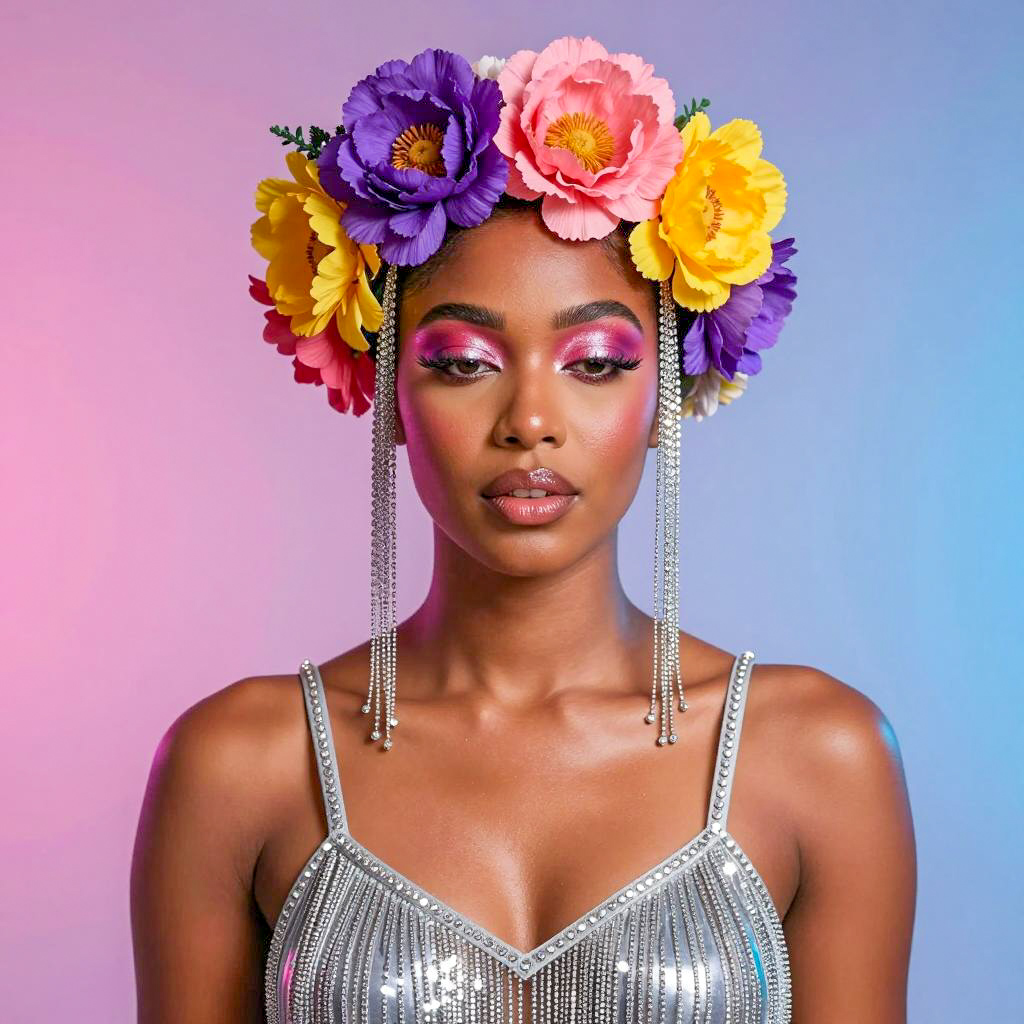 Woman with dark skin wearing a colorful floral crown with large purple, pink, and yellow flowers. She has shimmering pink eyeshadow and long silver chains hanging from her crown. Wearing a silver fringe top with sparkling rhinestones. Background is a gradient of pink and blue. Her lips are slightly parted. Upper body only. Illuminated with colorful lighting. Stylish, vibrant, detailed, fantasy-inspired.