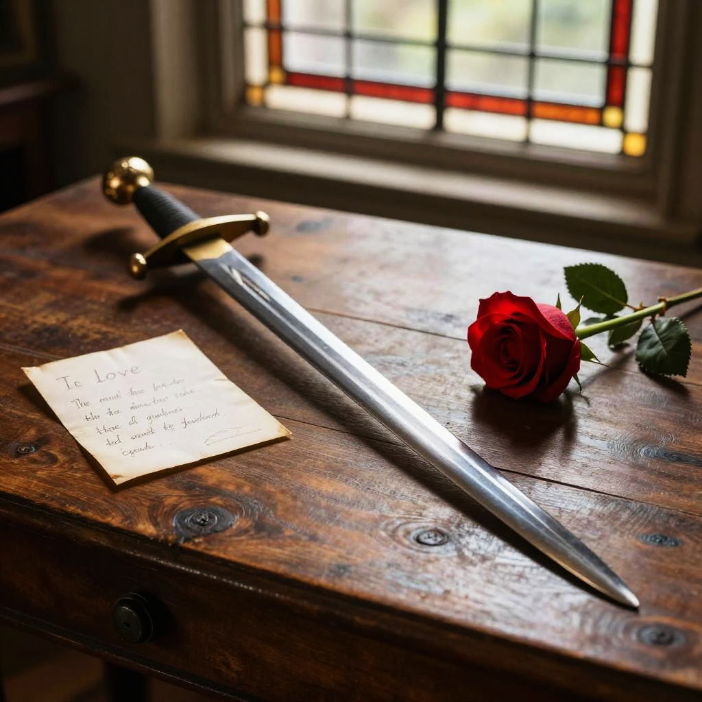 A vintage Renaissance-style sword lies on a rustic wooden table next to an aged love letter and a single red rose. Soft natural light filters through a stained glass window, creating a warm and intimate atmosphere evocative of tragic romance.