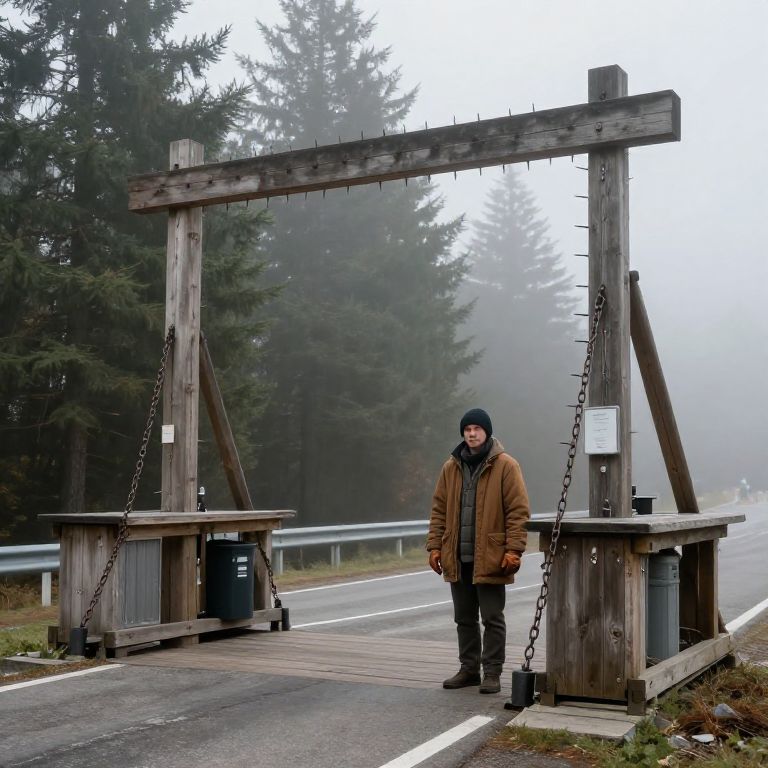 Tollkeeper at a fog-shrouded mountain pass toll station, rustic wooden structures with chains and spikes, clad in warm layered clothes and leather gloves, surrounded by towering pine trees and swirling mist, moody and mysterious ambiance.
