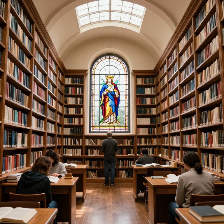 Photograph of a traditional library with tall, wooden bookshelves filled with colorful books on both sides. A large, arched stained glass window depicting a blue-robed saint in the center background. Four individuals, three seated at wooden desks in the foreground and one standing in front of the bookshelves, are focused on studying or reading. The floor is polished wood, and the ceiling features an arched, skylight window allowing natural light to fill the space. The overall atmosphere is quiet and scholarly.