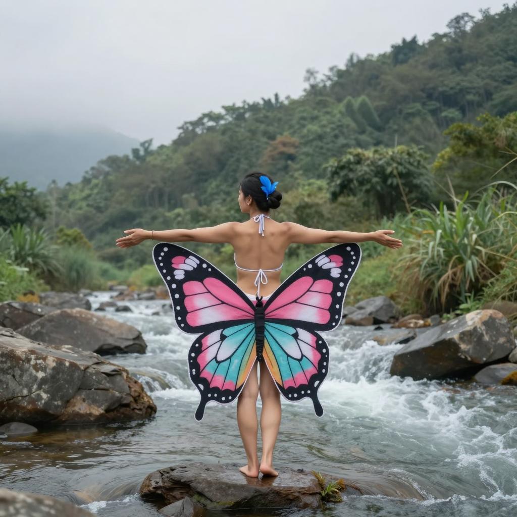 Asian woman with dark hair, blue feather in bun, standing on rocky stream, barefoot, butterfly-shaped towel, pink, white, black, and teal, back view, arms outstretched, overcast sky, green forested hill, flowing water, @laideyernt .