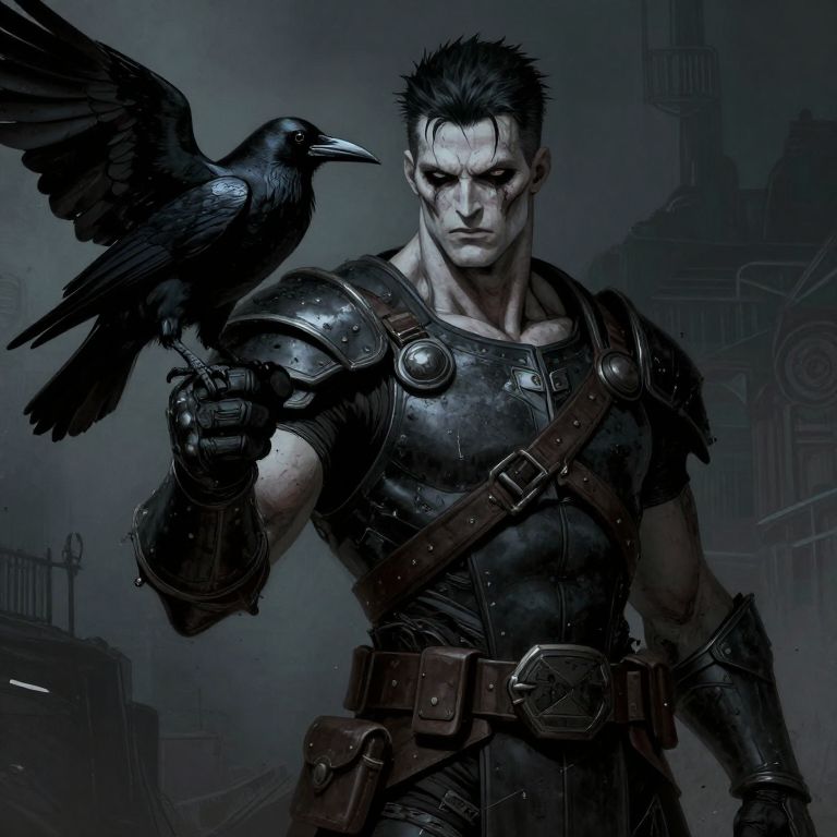 Digital art of a muscular, pale-skinned man with short, spiked black hair and intense expression, standing in a dark, misty, industrial setting. He wears dark, metal armor with leather straps and a brown belt. A black crow with glossy feathers perches on his right shoulder, its beak pointed forward. The man's left arm is partially raised, showing a leather glove. The background is blurry, featuring faint outlines of industrial structures. The overall color palette is dark blue and black, creating a grim, Gothic atmosphere. The art style is hyper-realistic with a focus on detailed textures and dramatic lighting.
