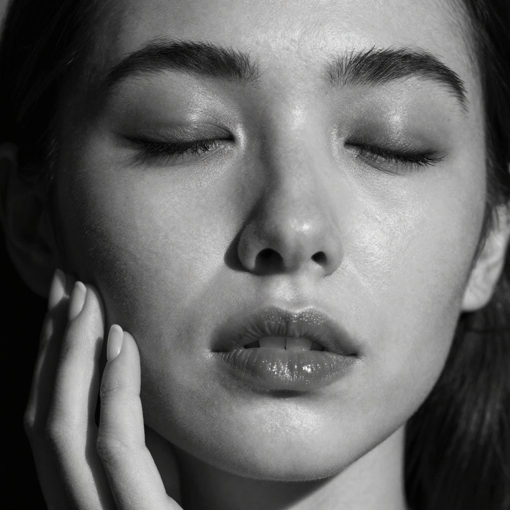 This is a black and white, high-contrast photograph of a close-up of a woman's face. Her eyes are closed, and she has a serene expression. Her skin is shiny, almost reflecting light, and her lips are slightly parted. A dark, textured hand is gently touching her cheek and chin, adding a dramatic effect to the image. The lighting emphasizes her facial features and the texture of her skin.