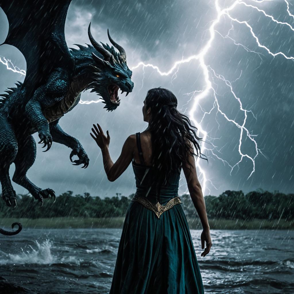 Fantasy scene depicting a powerful female enchantress standing on rocky terrain in a stormy environment. She is wearing dark blue and gold armor, with long dark hair flowing as lightning strikes behind her. Giant black dragon-like chimera wings extend from her back, emphasizing her magical power. The background shows a turbulent sea and dark clouds with heavy rain.